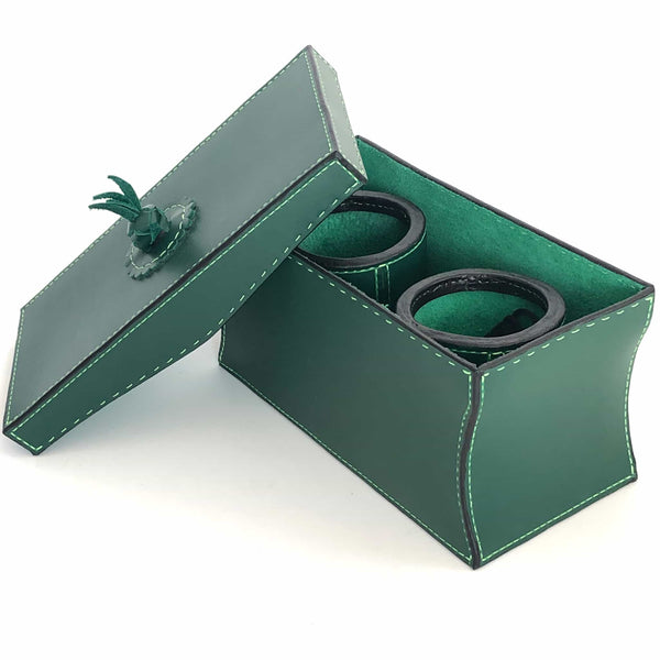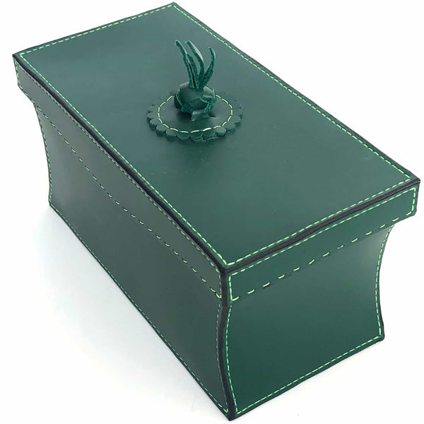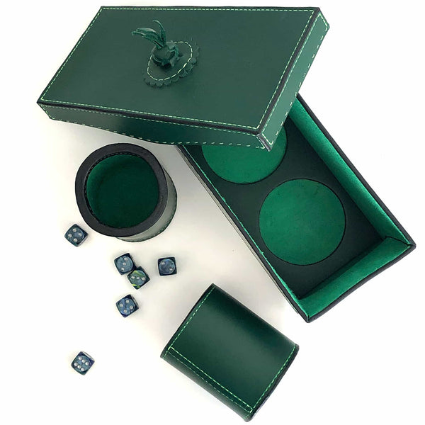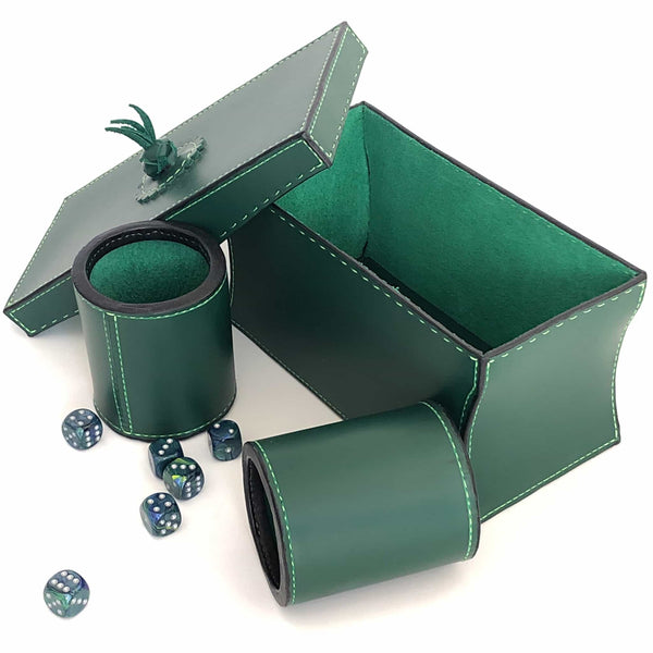 This one of a kind box is hand made and hand stitched has two dice cups nested inside. Each cup comes with 5 dice.