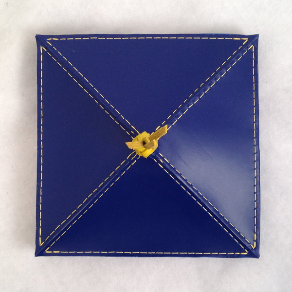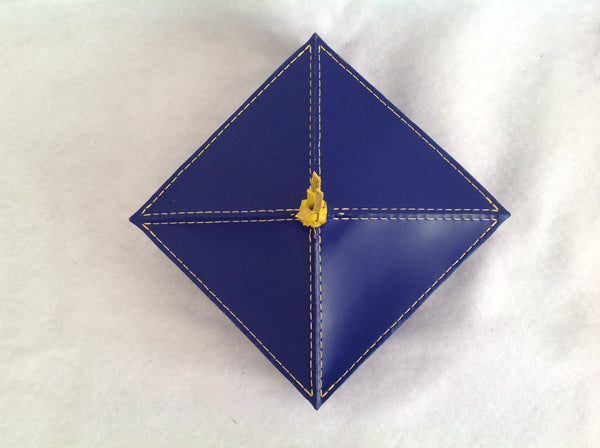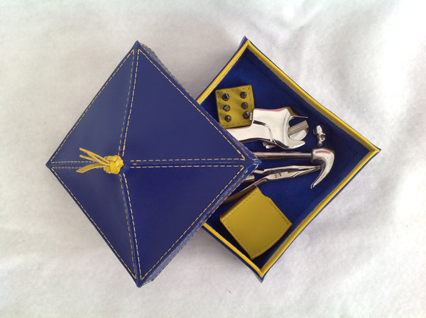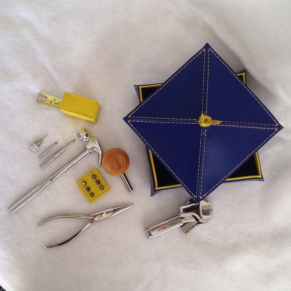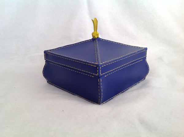 This unique square box is hand made and hand stitched comes with all the tools you need for having around the house.